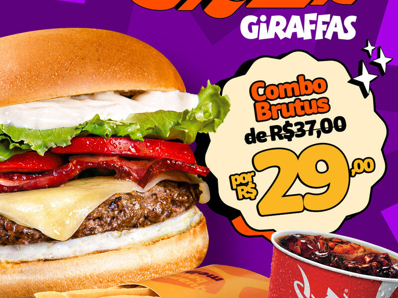 Para celebrar o Dia do Hambúrguer (28 de maio) e o Dia da Batata Frita (30 de maio), o Giraffas preparou uma promoção especial que acontecerá de 27 a 31 de maio. Durante esse período, o Combo Brutus,– sanduíche composto por pão, maionese, alface americana, tomate, bacon, hambúrguer bovino (aprox. 100g in natura) com tempero da casa, muçarela, ovo – acompanhado de batata frita e bebida – estará disponível por apenas R$29 em todos os restaurantes da marca.